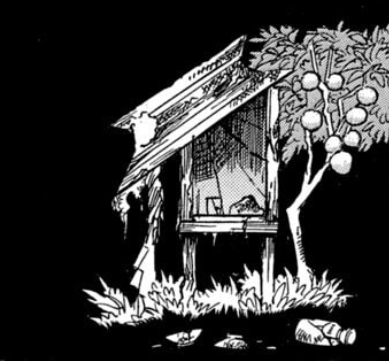 小さな桃の木の傍に今にも朽ちて崩れ落ちそうなこれまた小さなお社がある。)