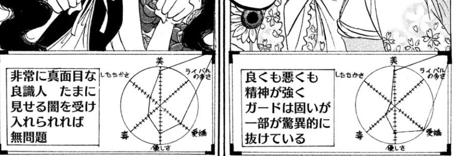 (これは私芥子が鬼灯様とジムでお会いした時のお話です) 芥子「鬼灯様、以前こんな話をした事を覚えていますか?私の元上司(白澤)が女性であればどこまで許容できるのかという話です」 ああ、ありましたね。 ……まさかアイツ遂に偶蹄目と!? 芥子「いえ、そうではなくて…あの時さまざまな女性のパラメーターを作ってお見せしたじゃないですか。 ……実は鬼灯様が何もおっしゃらなかったのでスルーした人のを作って来たんです」 (四つ折りにした紙を鬼灯様に差し出すとすぐに手に取って開いてくれた) これは…◯◯さんのですか? 芥子「ええ、桃太郎さんと一緒に作りました!◯◯さんの場合はまきみきのパラメーターにとても似ていると思います。違いと言えば毒気が少なくて優しさが伸びてます」 ……。 ![]() 確かによく似ていますね。 …特にライバルのところが (まるでアイドルのごとく突き破られたパラメーターを指差して鬼灯様が神妙な顔をしている) → |